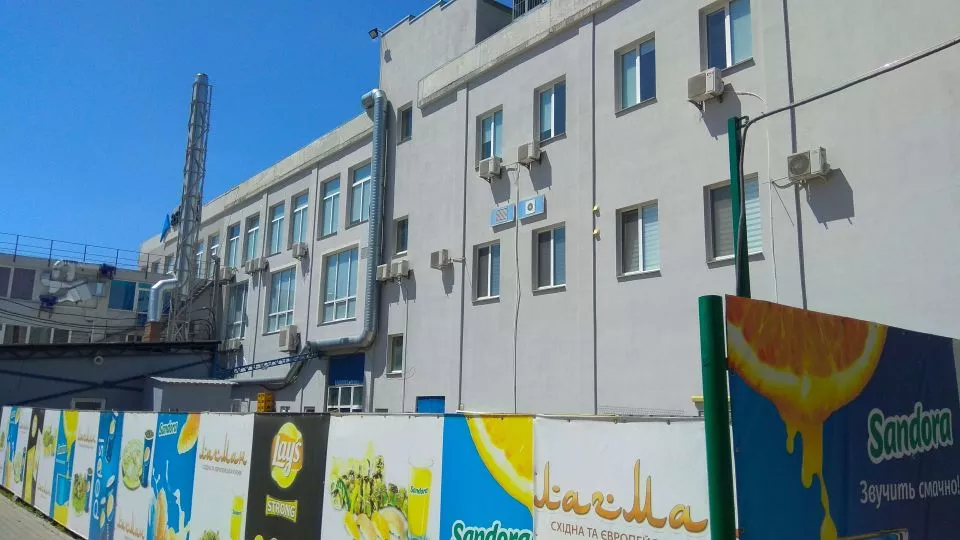 Торговый Центр "Жовтень" - трехэтажное здание с закругленным фасадом песочного цвета и стеклянными зеркальными панелями, установле...