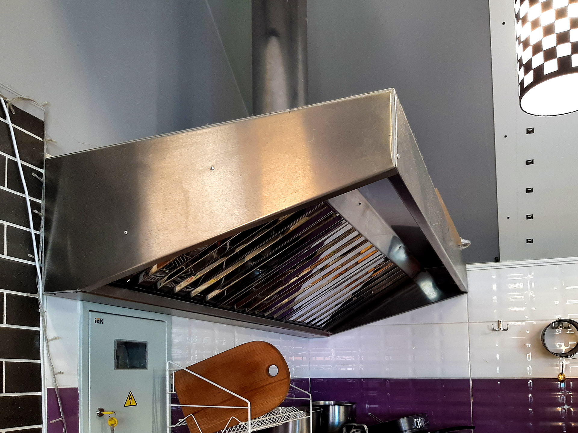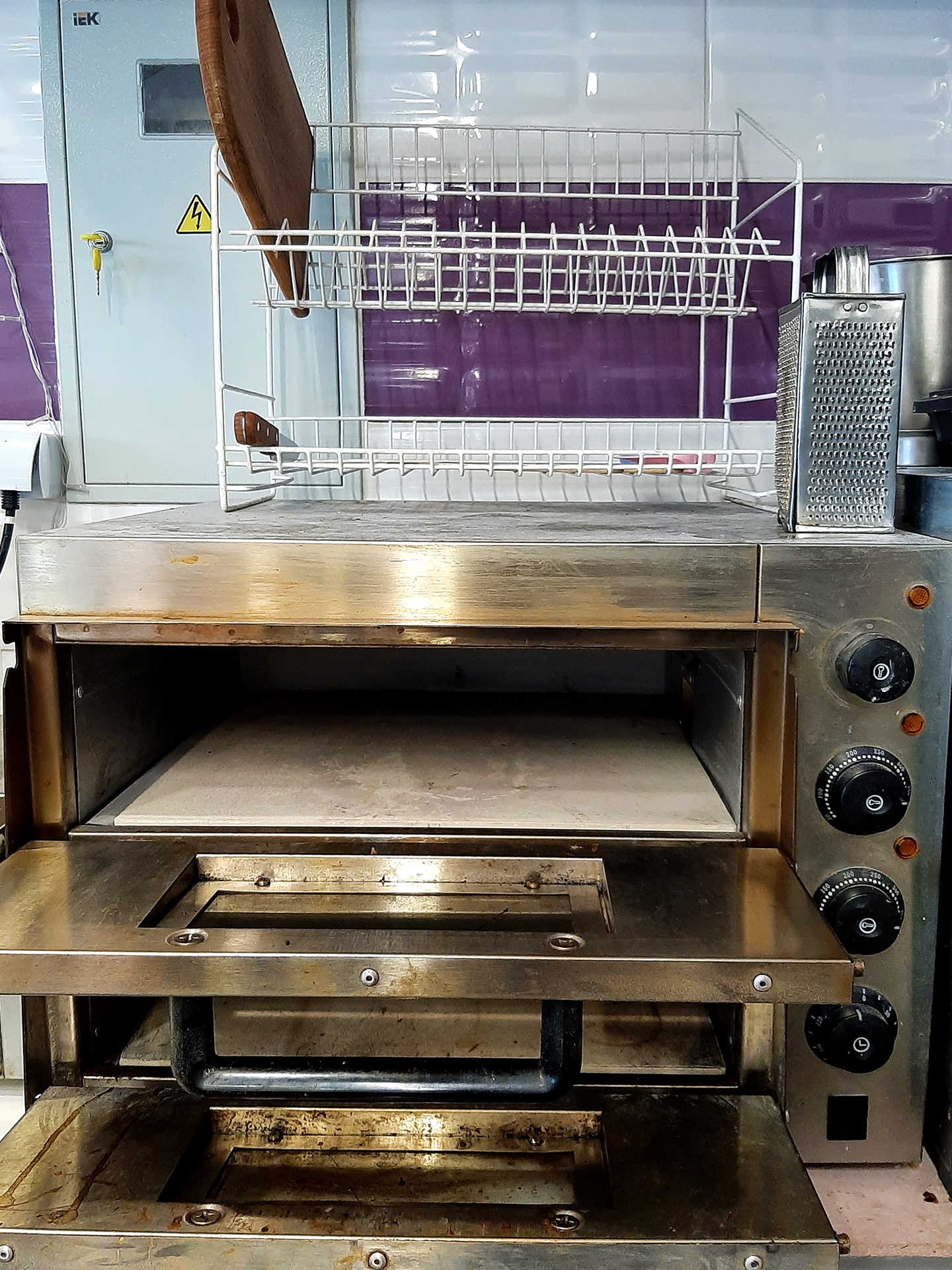 Обладнання кухні: подвійна піч для піци діаметром до 40 см, холодильний стіл для піци з мармуровою стільницею, піч для бельгійських вафель, великий двокамерний холодильник, мікрохвильова піч, потужна витяжка, стелажі, проточний кран гарячої води, весь необхідний інвентар для приготування та сервірування.