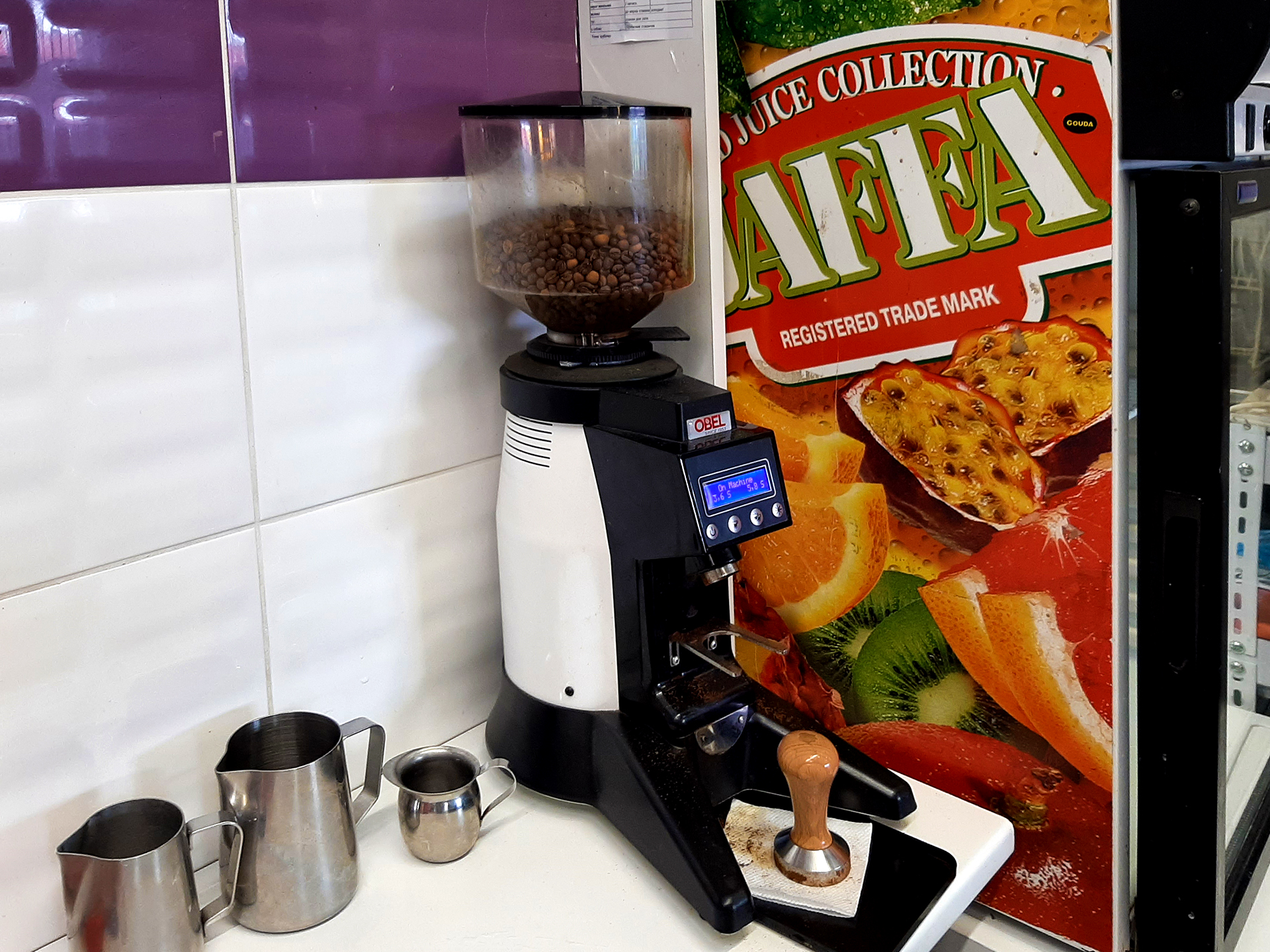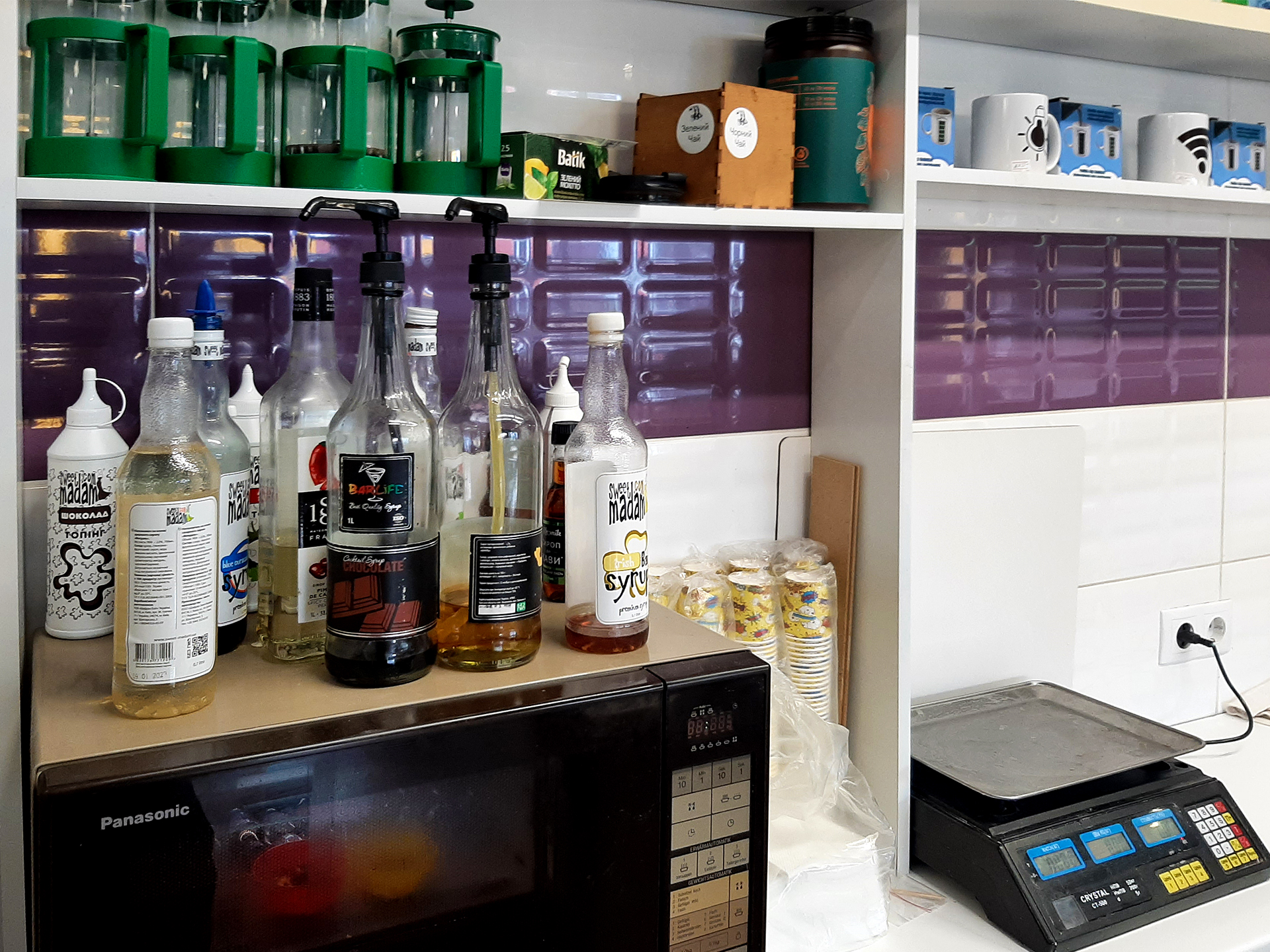 Обладнання бару: двопостова кавомашина, професійна кавомолка, барний холодильник, напольна холодильна вітрина для кондитерських виробів, міксер для молочних коктейлів, увесь необхідний посуд та інвентар включно з рушниками та одягом.