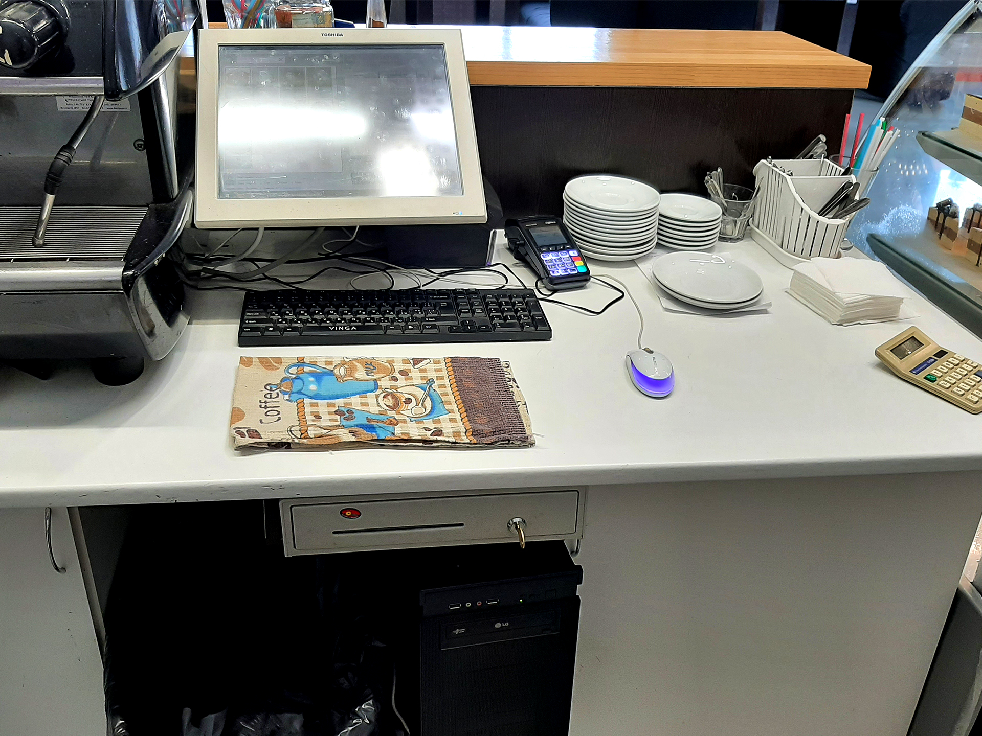 Встановлений POS термінал з програмним забезпеченням GBS market 6 (ліцензія безстрокова), дозволяє вести бухгалтерію, контролювати касу, залишки та закупівлю. Додатково встановлений блок HIPOS (ліцензія безстрокова) для фіскалізації розрахунків. Вмонтована грошова скринька.