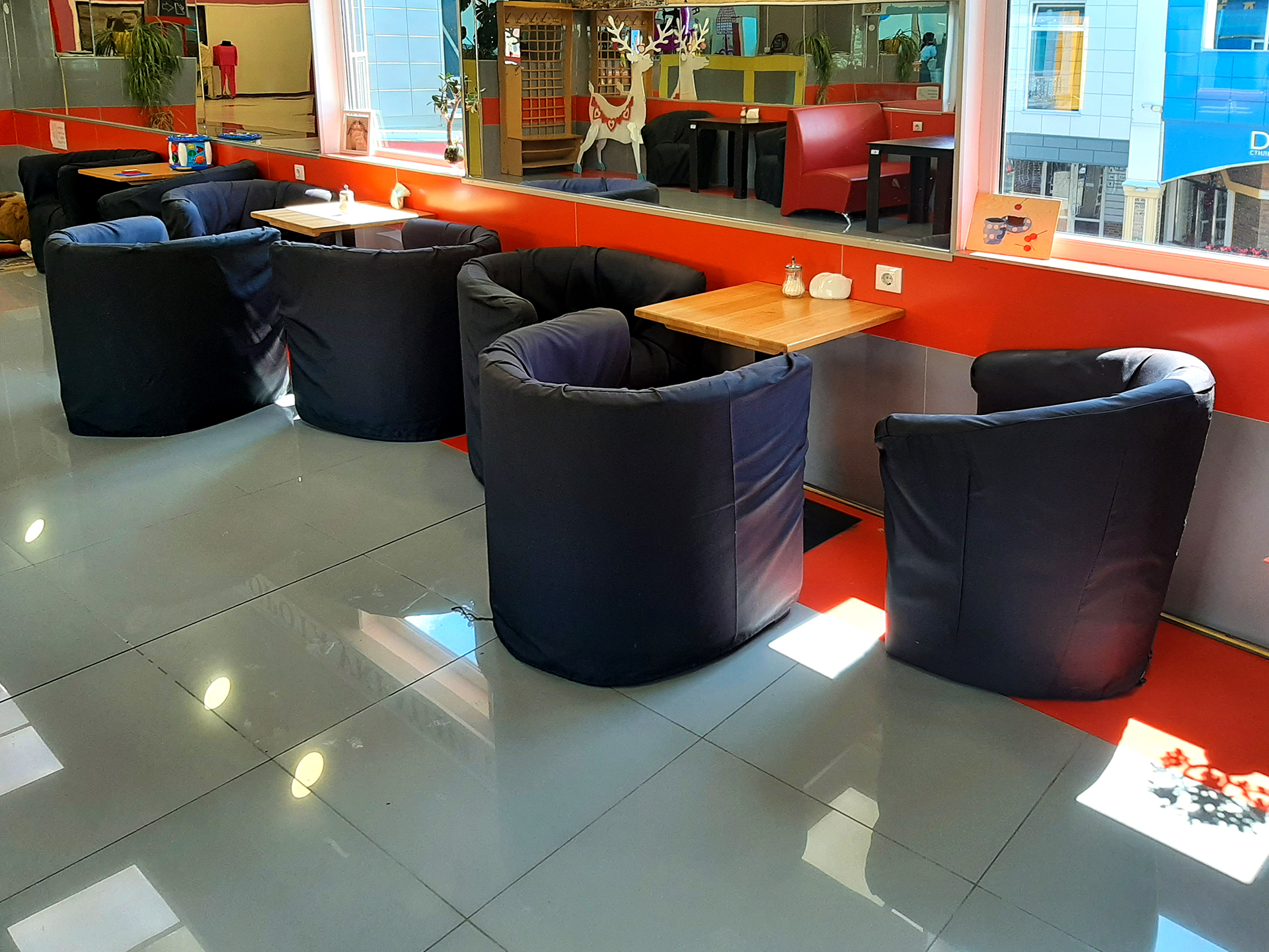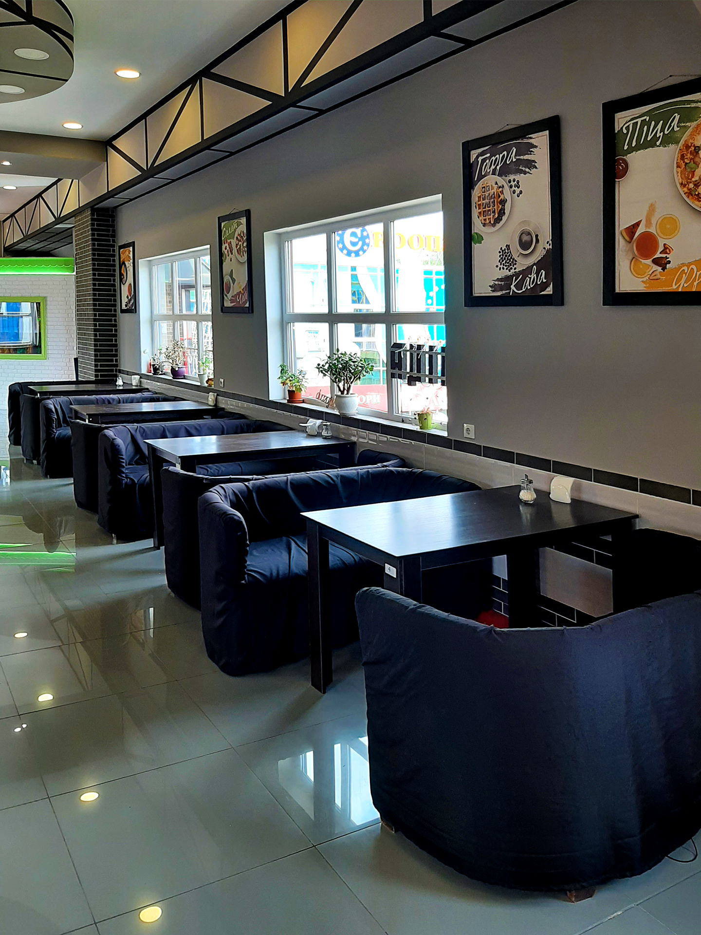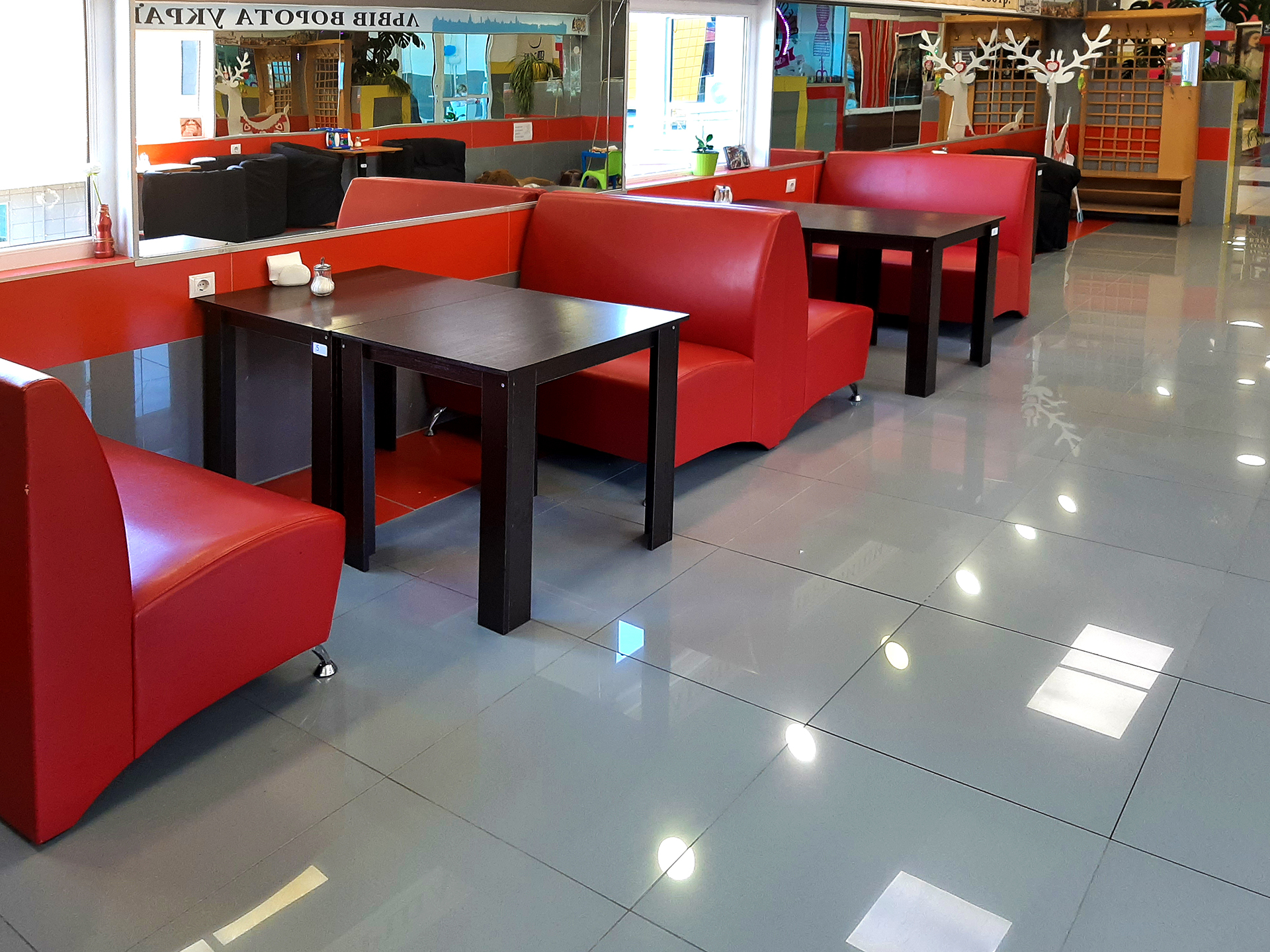 Обладнання залу: 12 диванів, 10 крісел, 10 столів різних форматів, невелика дитяча ігрова зона з усім необхідним, проведений інтернет, Wi-Fi роутер