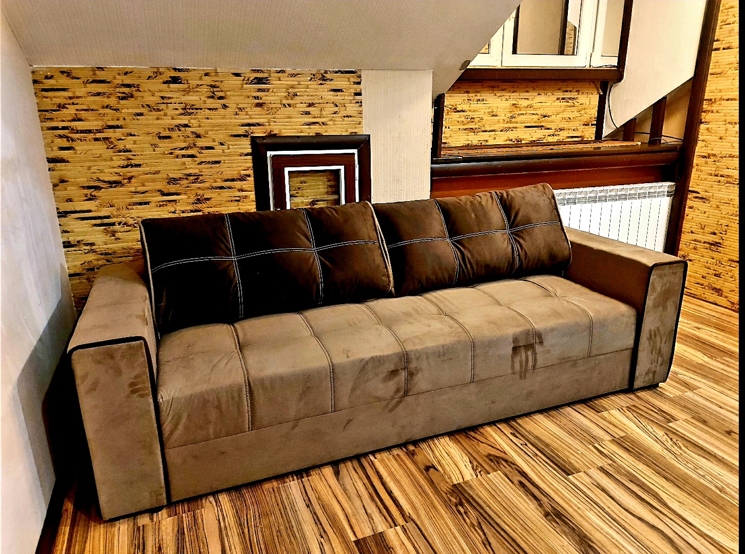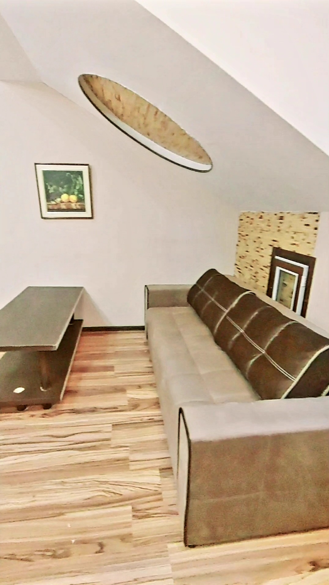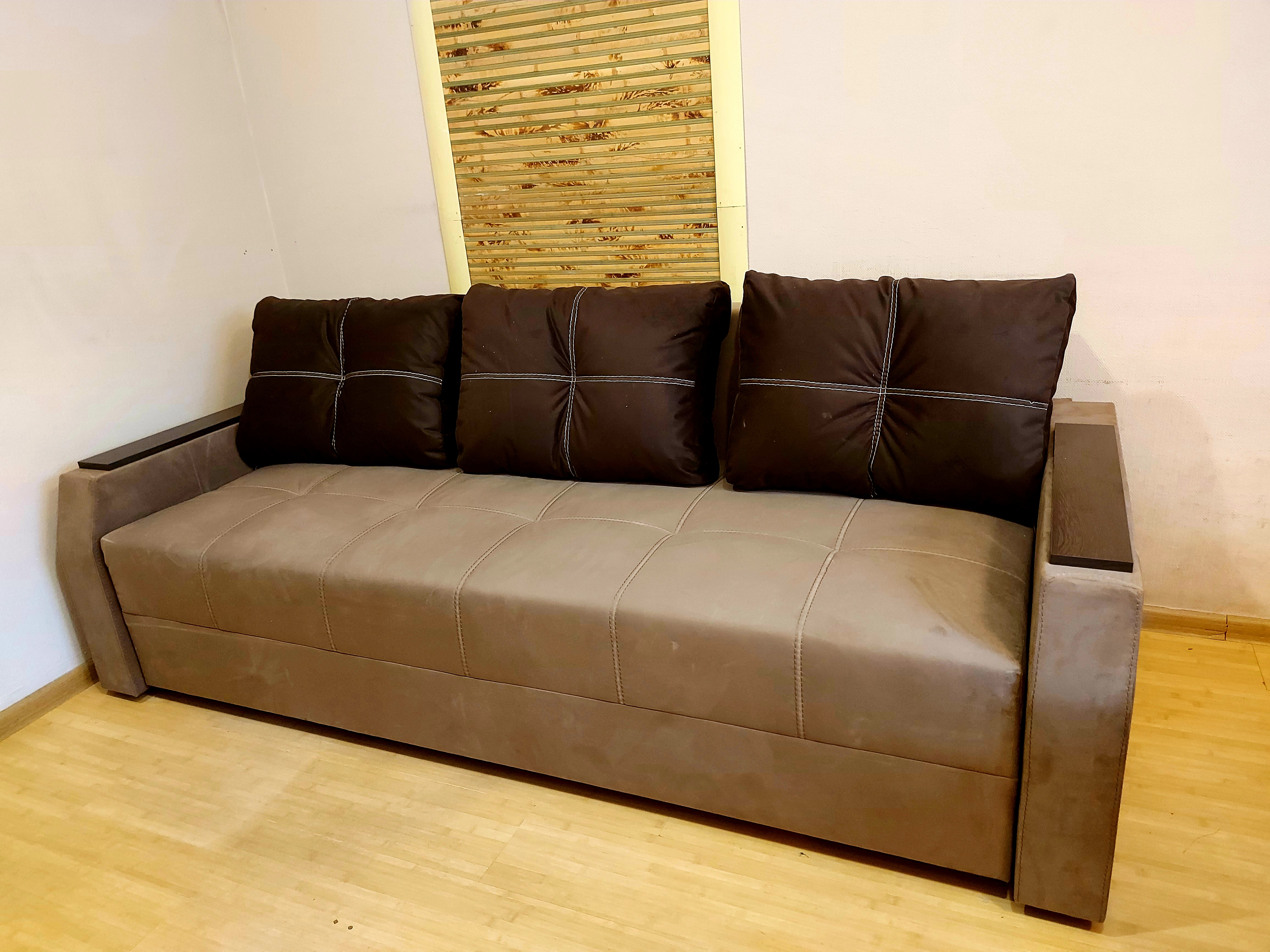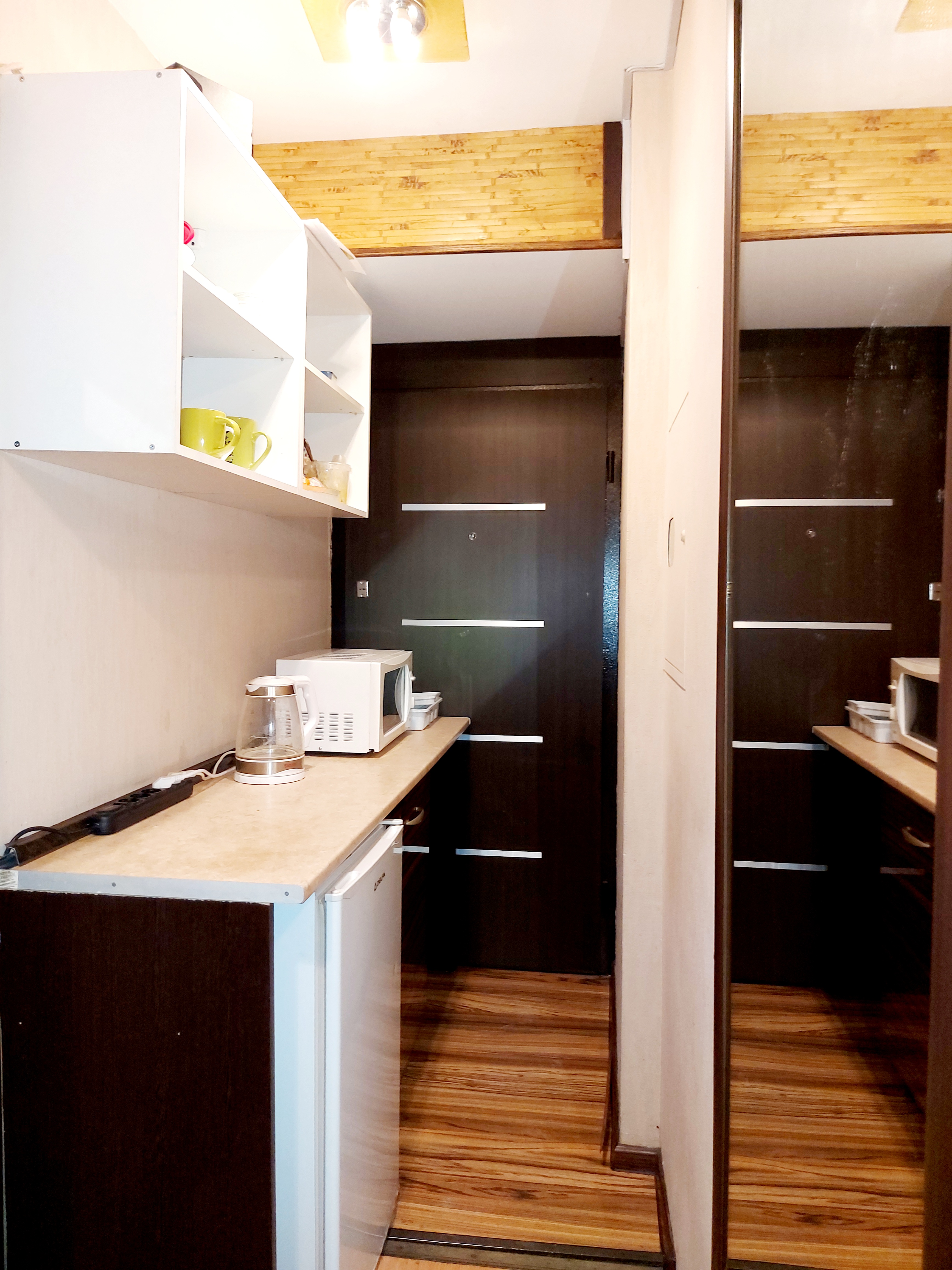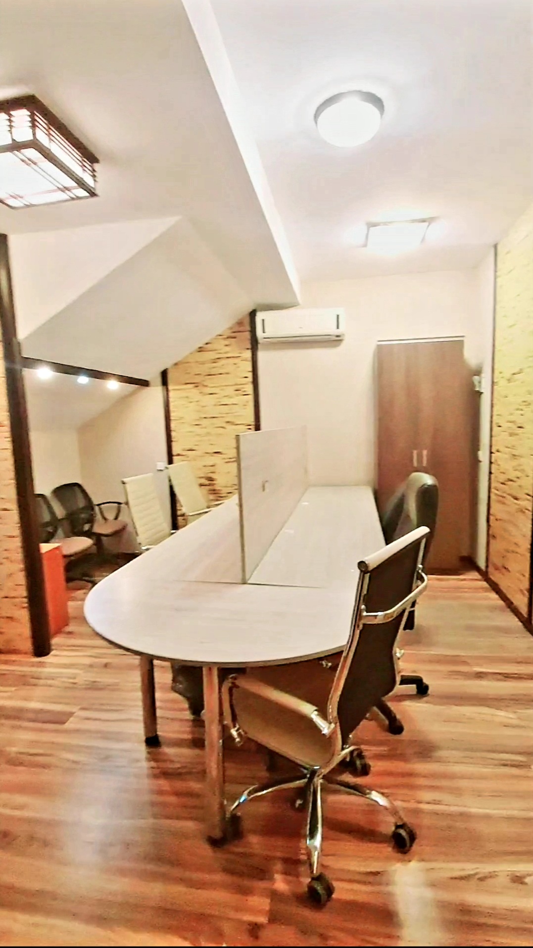 Меблі: 6 офісних столів, офісне крісло 2, 2 стільці, 2 дивани двоспальних розкладних, шафи вбудовані, двері-купе, полиці, стелажі, кухонний гарнітур.