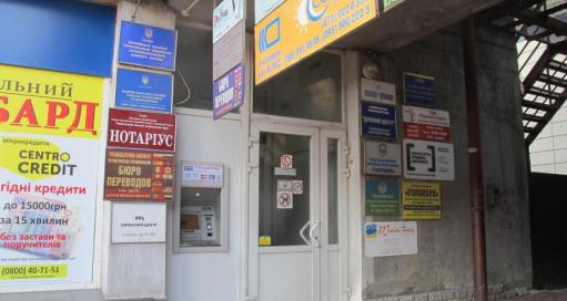 Поблизости с офисным центром разместились несколько магазинов с продуктовыми товарами, банкомат, пункт обмена валют и ПриватБанк..